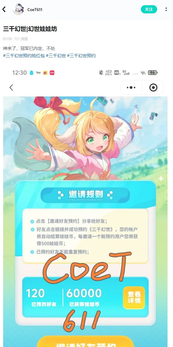 点击文末话题#三千幻世预约抢红包#,进入活动话题页,点击右下角「+加号」参与活动投稿