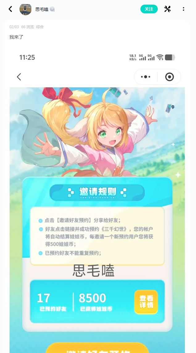1、只要带图发帖,分享你在幻世娃娃坊的游玩体验,并且附上邀请好友的界面截图,即可参与活动!苏苏将挑选邀请好友数量排名前3的复序者,送上京东卡奖励。