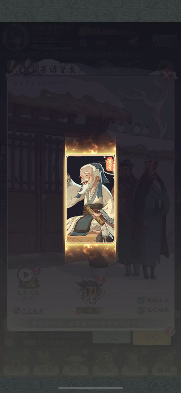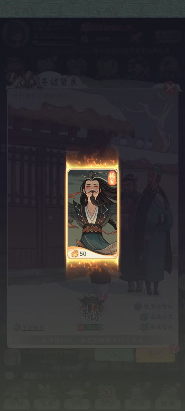 第三个是名仕,顾名思义啊,就是这个游戏的角色打各类的怪兽,还有征战匈奴都需要这个角色,升级的话,全部拉到100级,然后100级之后全部养稀有,可以固定一个主c直接升,然后就是后面有抽卡抽卡的话,这个是有大保底的300抽一个大保底