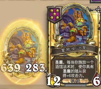 前面有四本的招牌计时机提供法术,再搭配蓄能沙女皇实现群体增益。这张卡的效果是在施放一个酒馆法术后,会对有圣盾的随从群体加攻击力,合金之后一张法术可以群体+6攻击力。因为机械是可以贴圣盾和风怒的,加的攻强属性可以翻倍计算,这张卡是核心成长组件,在拿到招牌计时机后可以升五多刷一次找一下。