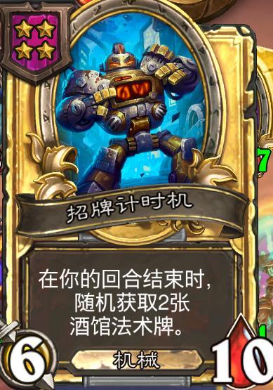 整个流派是围绕法术展开,四本的招牌计时器可以稳定获得酒馆法术,合金之后每回合结束就能稳定获取2张酒馆法术,再搭配达卡莱附魔师,一轮就是四张酒馆法术,实现经济循环和体系成长。这张卡是体系启动核心,升本节奏以最快拿到招牌计时机为主要目标,如果你刚升四本就遇到了招牌计时机,基本就可以稳前四上分了。