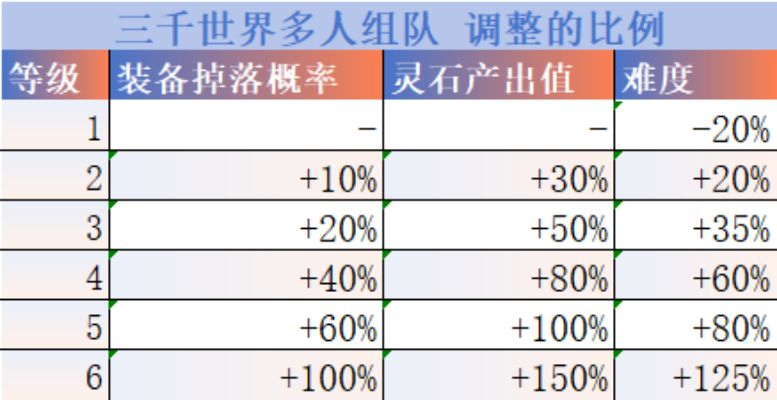 以上为三千世界多人组队调整的比例,6级三千世界调整后,比调整前装备掉落概率增加了1倍,单个灵石产出的值增加了1.5倍,当然,对应的难度也提升了