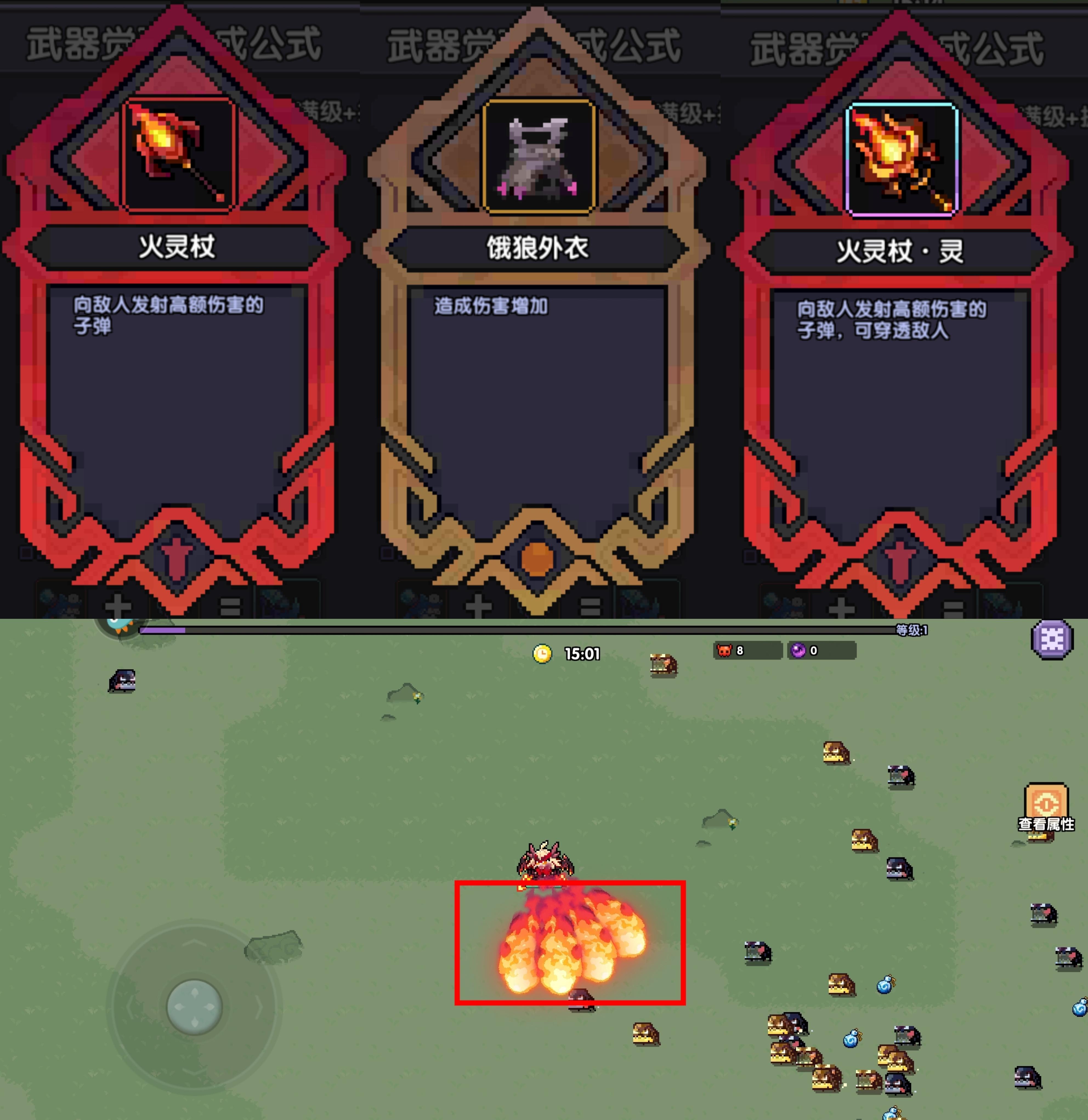 水矛对单强势,打boss快;水枪满屏子弹,输出占比经常断层领先;火剑沾光赌狗戒指,但本身也不算很弱,赌狗戒指对另外三个武器帮助都挺大;火灵杖觉醒前不太行,觉醒后质变,非常爽。