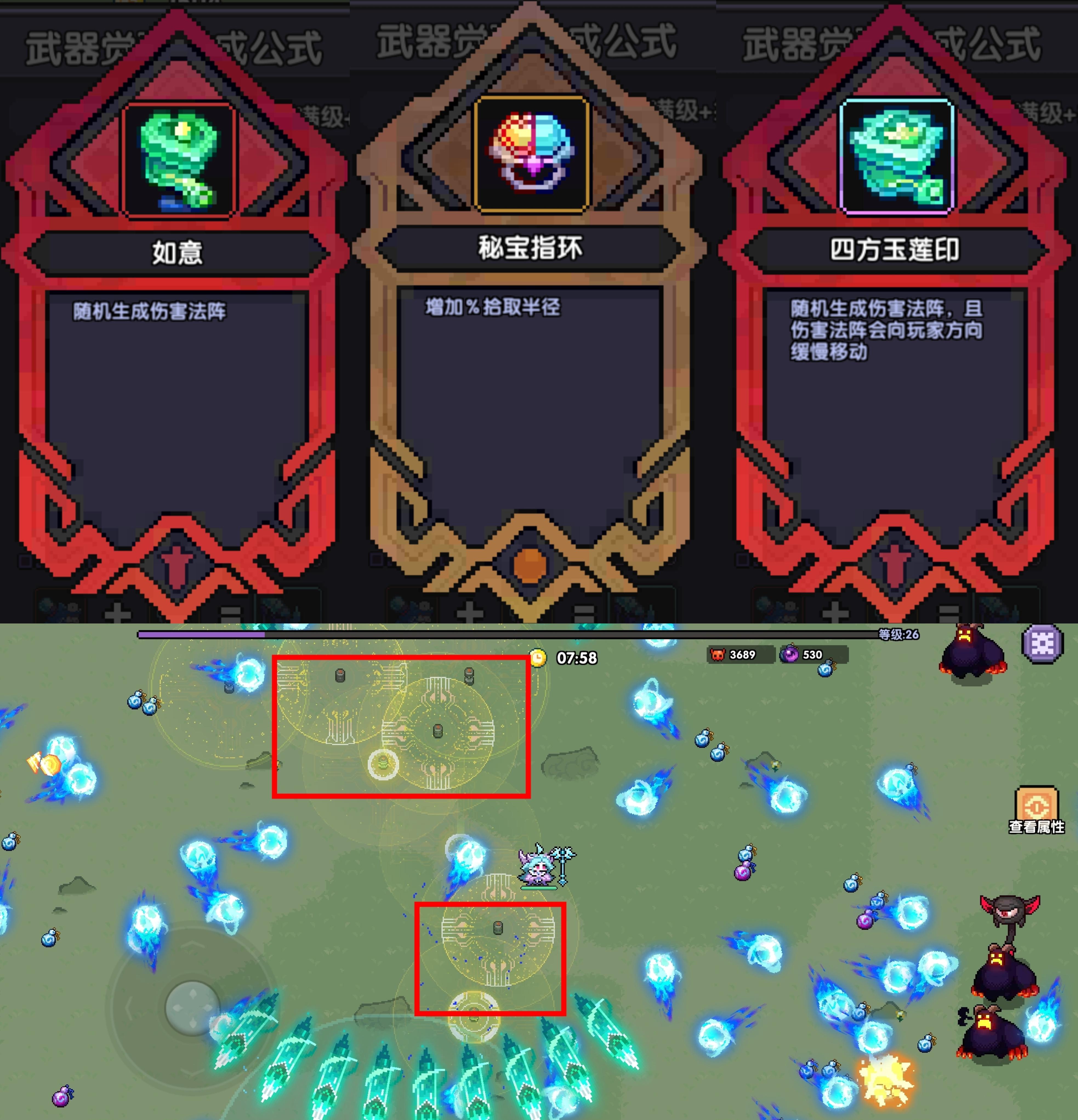 局内右侧可点开武器合成公式表,这个表既可作为图鉴,也可作为单局中的装备背包,局中获得的武器会标亮,下方的点数就代表着星级。