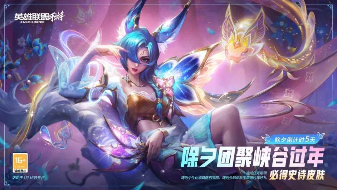 峡谷贺新春,福利惊喜不停!除夕活动火热来袭,完成任务必得史诗皮肤,还有精选个性化道具随机宝箱、精选分路皮肤宝箱等过年好礼等你拿。看,霞身着绝美新装扮蛇年限定皮肤来给大家送祝福啦~除夕倒计时5天,准备好和小伙伴们团聚峡谷,欢乐过年!