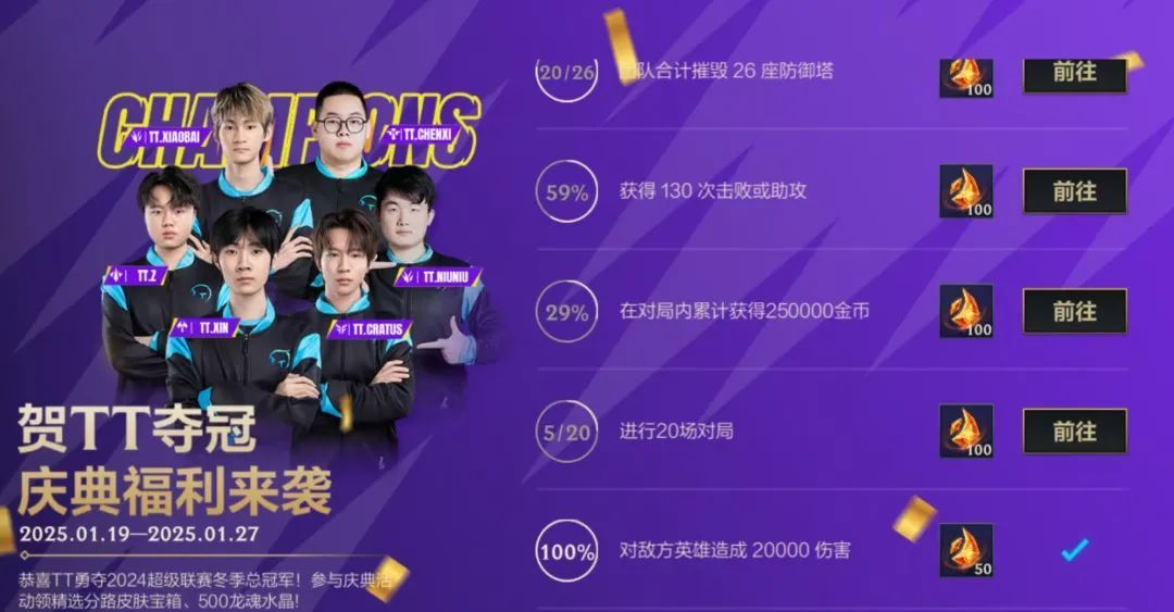 1月19日起恭喜TT战队勇夺2024超级联赛冬季赛总冠军送分路皮肤宝箱;