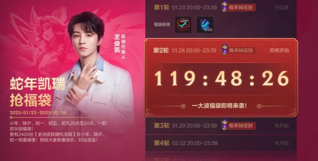 即日起,截止至2月6日,小年、除夕、初一、初五、初九20:00至24:00,一起欢乐抢福袋,更有2400份史诗皮肤随机宝箱在小年、除夕、初一惊喜掉落!预祝大家新春快乐,好运连连!