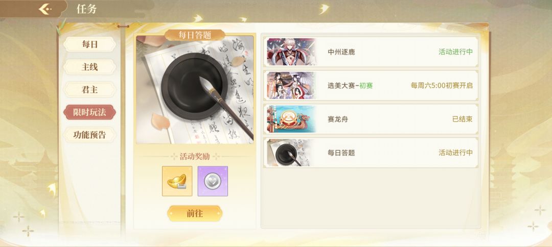 1.每日任务,五分钟左右可以搞完,100绑到手,简单 2.主页的排行榜,点赞5次可获50绑 3.门派龙舟活动,登船,18:30参加活动,最少有80,多的130绑 4.还是门派,门派试练,30绑5门派,砍价砍到负的可以白拿货物和负绑金 6.图鉴 7.中原逐鹿,参加比赛拿绑 8.君主政务升一级30绑 9.每日答题 10师徒商铺换金 11传记封地瀛洲探灵都可以拿绑 12侍臣技能有钱任性,上线300 13成就奖励 14各种跨服冲绑 15皇子达成好像有两千多绑 16官方的各种兑换码 17 还有各种活动 应该差不多了搞金搞金,加油加油早日拿祖