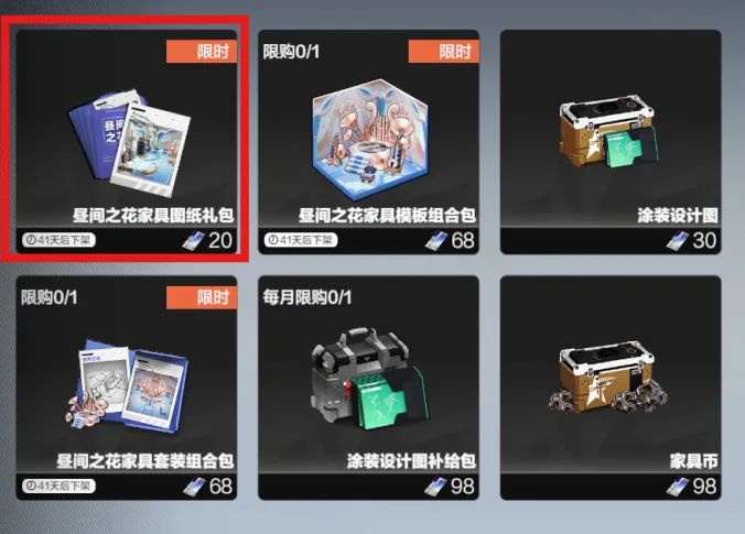 注:本文宿舍是按20虹卡的“昼间之花家具图纸礼包”进行搭配的(下图红框礼包);
