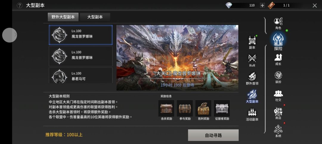 大型副本怪物被击杀或限定时间结束时,大型副本结束。