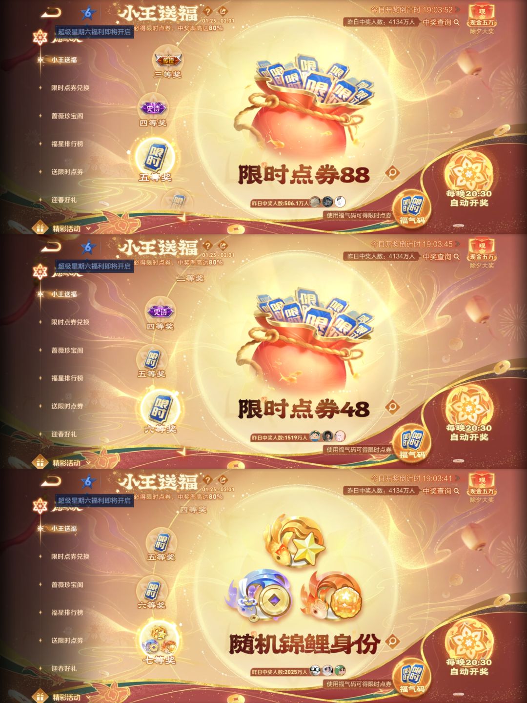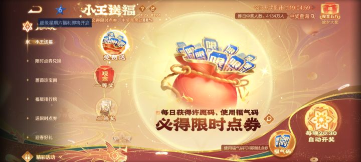 每人每天都能随机分配到一组许愿码+限时点卷,每天晚上八点半准时开奖,皮肤中奖率很高