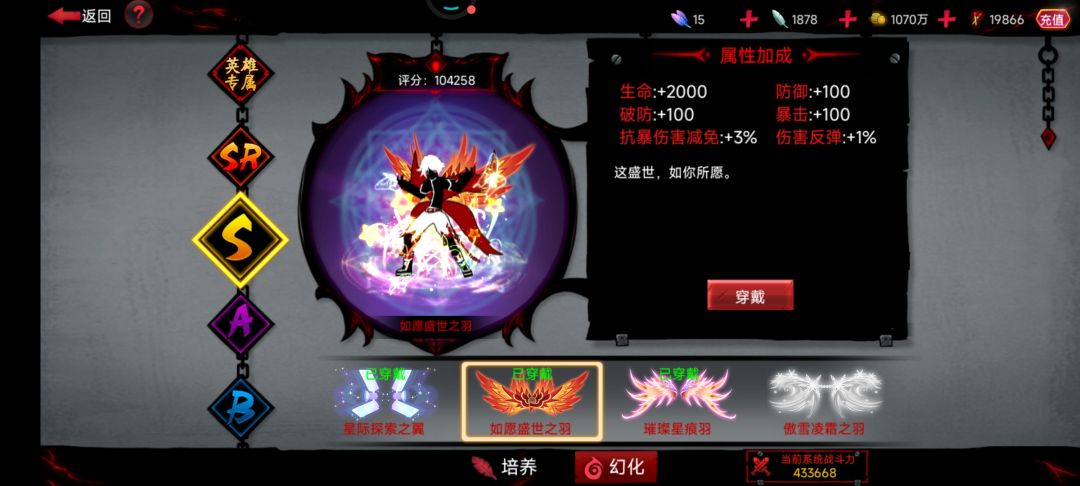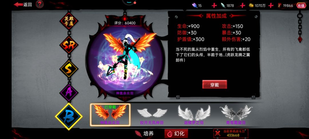 其中最喜欢的是艾琳搭配其专属翅膀加上天使之翼光环这一套搭配,将艾琳女王般的霸气体现的淋漓尽致,感觉这套搭配就是为艾琳而生。玄奘搭配暗夜南瓜之羽也异常很配。岚搭配星际探索羽翼和V搭配华月织金羽翼以及砂搭配不死鸟之羽并结合蝶恋花也很好看。神凰焱炎羽虽然是B类翅膀但我觉得颜值完全不输S类翅膀,搭配雷或剑心霸气十足!