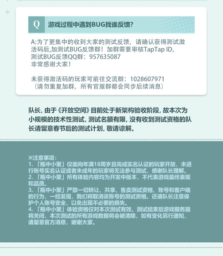 A:为了更集中的收到大家的测试反馈,请确认获得测试激活码后,加测试BUG反馈群!加群需要审核TapTap ID,测试BUG反馈QQ群:957635087