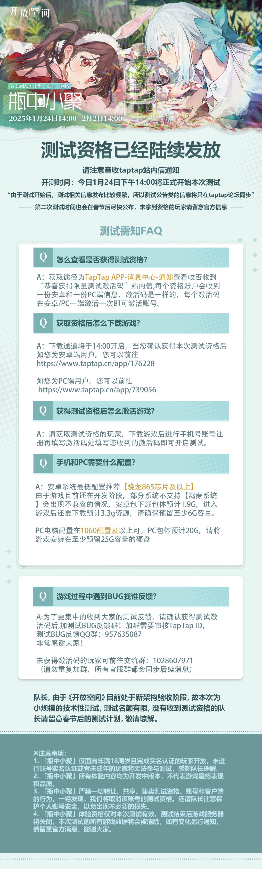 1. 「瓶中小聚」仅面向年满18周岁且完成实名认证的玩家开放,未进行账号实名认证或者未成年的玩家将无法参与测试,感谢队长理解。