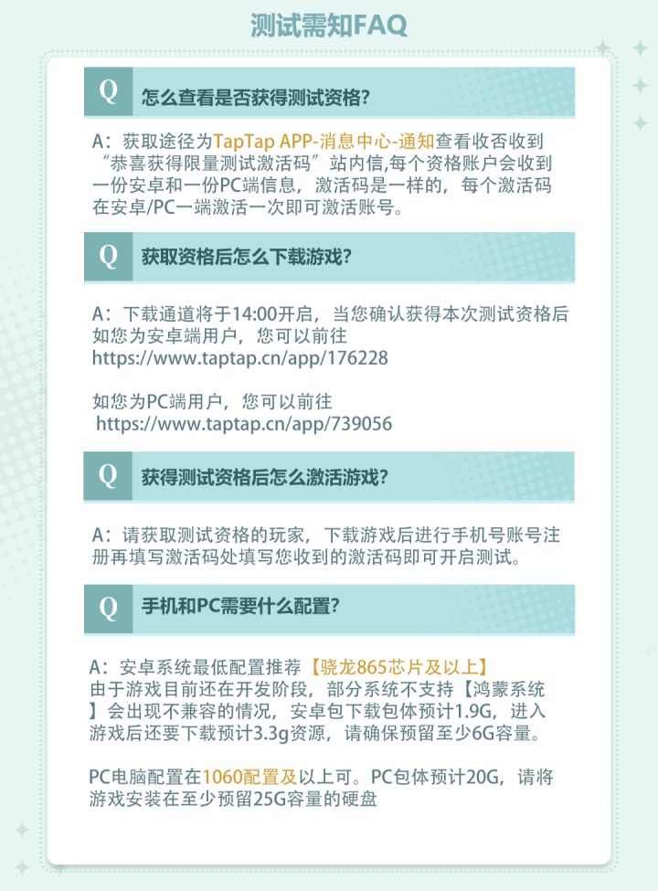 A:A:获取途径为TapTap APP-消息中心-通知查看收否收到“恭喜获得限量测试激活码”站内信,每个资格账户会收到一份安卓和一份PC端信息,激活码是一样的,每个激活码在安卓/PC一端激活一次即可激活账号。