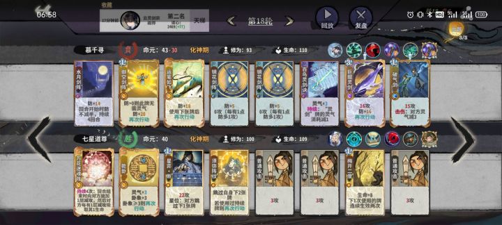 另外讲讲共鸣突破选择:剑招融汇必选,如果没有六轮刷新80%会有,这个很重要不仅可以到化神加4张牌修为,最重要的是你前期把剑阵牌给换掉很大几率会出连环,其他也是一样。小技巧就前期不要选,到化神再选,连出8张牌出化神牌几率很大。突破的话筑基本命必选,金丹本命我一般不会选,就是你开局给的共鸣不好,就算加一张牌也不一定会是想要的牌,开局给的好就更没必要选果修