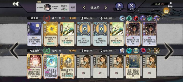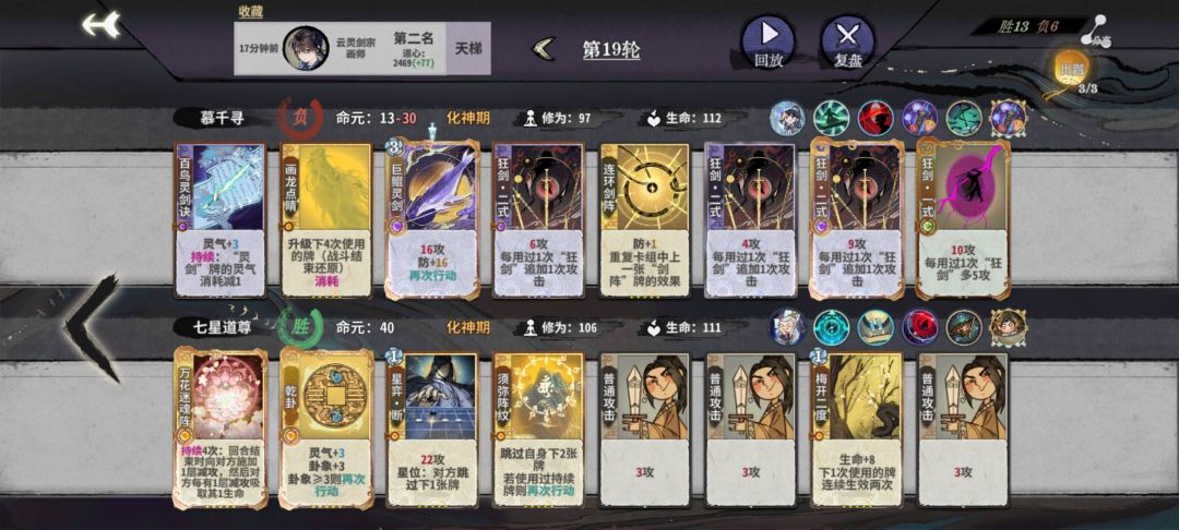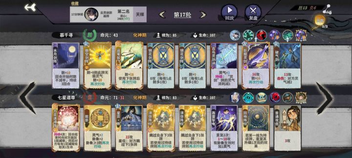 另外讲一讲这个角色吧,我个人比较喜欢副职玩画,因为化神连环好出。我的手牌会留下剑阵牌水月,镜花,加运笔,可以3动杀,本身修为就高,基本对面2动死。留3张牌并不多。玩万法剑要留更多牌。连环,狂剑本身就需要。在对面有有减攻的情况下不要迟疑直接上剑阵,最好打的是玩毒奶的,只要对面二动没输出绝对凉,质量不够后面再补两张连环。