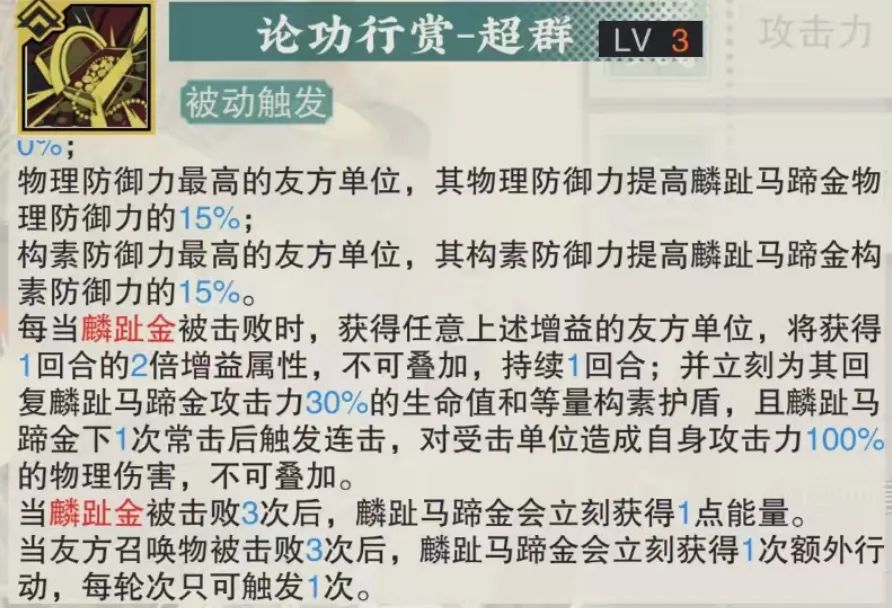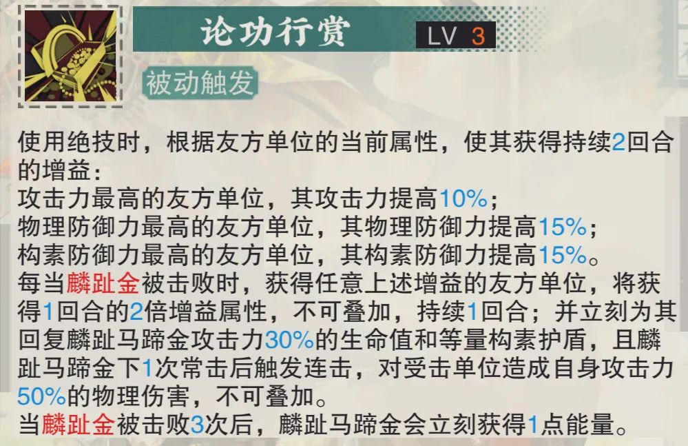 接着在麟趾金被击败后,享受到属性增益的队友还能获得生命回复和护盾施加,且每次麟趾金被击败后这个效果都可以触发一次,因此针对享受到属性增益buff的队友,马蹄金的这个生存辅助效果那是相当明显的,在实测的时候维一真是有一种完全死不了的......错觉。然后被动2还给了马蹄金一个条件触发连击的效果,且每3个麟趾金被击败后,马蹄金还能获得1点能量,而这个连击效果客观说因为基础伤害幅度并不算高,因此在3-6致知前其占马蹄金总伤害的比例较为有限,接着回能效果其实就是为了保证马蹄金可以稳定2回合触发1次大招而设,当然也有可能是为了稳定1回合触发1次大招而设。