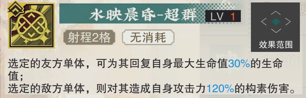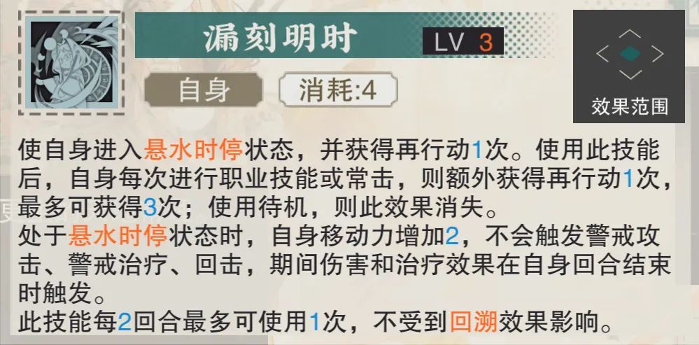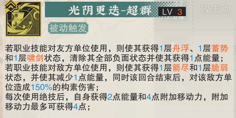 然后当铜壶提升到3致知之后,被动1给友方时还能施加1层“啸剑”状态,这也相当于补完了铜壶自身的增伤辅助能力,接着额外还有驱散与回能的能力,算上待会儿会讲到的被动2技能,铜壶的辅助能力相当于就是给拉满了......然后再给敌方施加的施加方面,3致知会让铜壶新增减少其1点能量和额外造成伤害的效果,这里如果是对多个敌方进行职业技能输出的话,这个额外伤害的综合效果还是不错的。(哦对了再补充下,铜壶再动期间会体现出极为夸张的战场覆盖能力,毕竟4次再动外加移动力的提升几乎能让铜壶的足迹遍布整个战场了)最后这个3致知最为关键的效果就是使用大招后可以获得2点能量,这也变相让铜壶的武器、深造方向等有了更多的选择,毕竟想要稳定2回合放一次大招才是实现铜壶强度的最佳方法,虽然说铜壶每次再动期间用普攻也能回能,但是这就会浪费职业技能的输出或奶的机会,因此这2点能量的自动回复相对也就解放了很多限制铜壶每隔1回合即可释放一次大招的可能性,让铜壶的技能循环有了更好的保障。