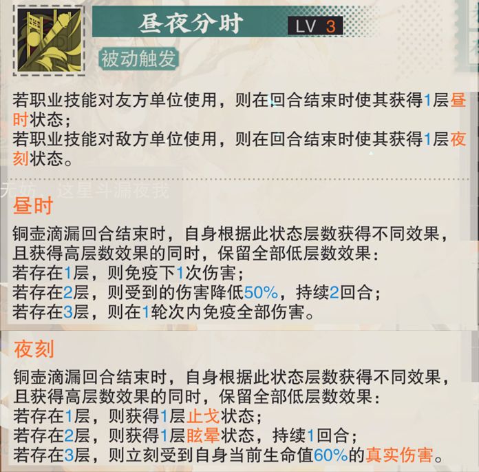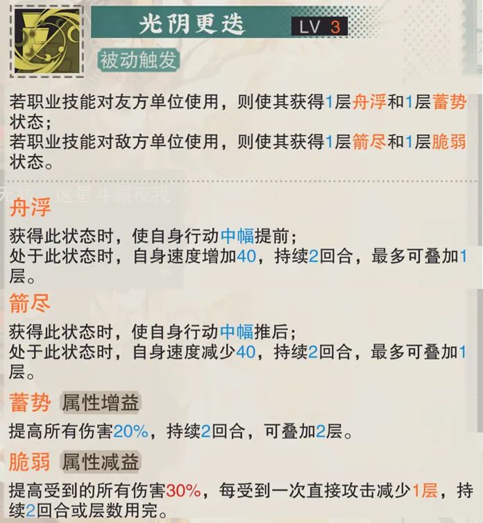 然后是铜壶被动1技能的总结,其实铜壶的前两个被动都是为了职业技能的不同使用而设,例如被动1会根据铜壶的使用对象来施加增伤+提速buff或受伤提升+减速debuff,这个“蓄势”增伤和“脆弱”的受伤提升大家已经非常熟悉了,而这个提速和减速的效果说白了就是直接作用于行动条的效果,在施加提速或减速后,作用目标在铜壶的回合结束时即可立刻按照增加或减少后的速度来重排行动条,这点也是铜壶非常重要的一个辅助能力。