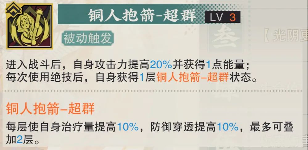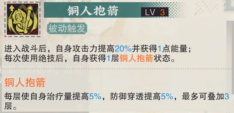 铜壶的最后一个被动则可以让铜壶第1回合能稳定的释放大招且提升进图后的攻击力,此外还有一个需要暖机的治疗与穿透提升,这部分上限也并不算高,即使是提升到1致知后......这个效果依然只能算是锦上添花。