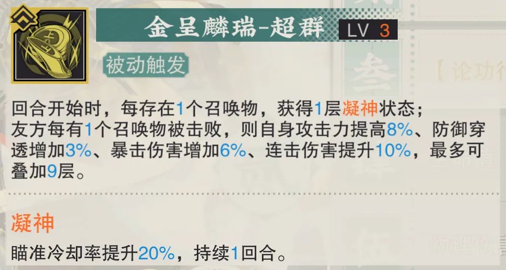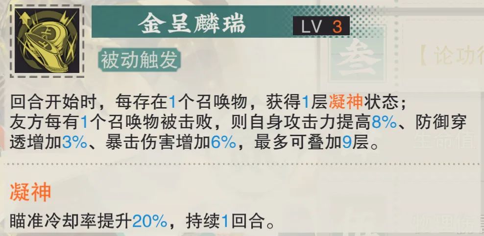最后马蹄金的被动3技能可以按照存在召唤物的数量来提升自己的瞄准冷却率,接着这个技能的关键是可以按照被击败召唤物的数量来提升马蹄金的攻击、爆伤和防御穿透,虽然单词的频率并不高,但因为最高可以叠加9层的缘故,这个技能的提升上限还是相当可观的,当然这个技能想要达到上限,暖机时间也不短,大部分时间在3致知前提下,仅靠马蹄金自身也得3回合后才能完成暖机。