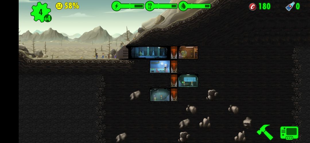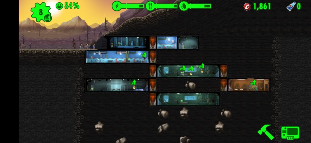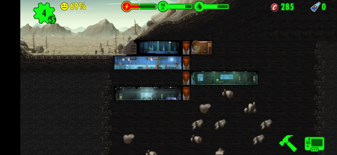 - 接下来,收完菜就下线,持续重复这个操作把资源攒满,把收集50水的任务做了拿午餐盒,用开出来的瓶盖在第五层造电梯和一个电厂(造在电梯右边呈交叉型),拖小人进去生产,慢慢造成三联电厂。