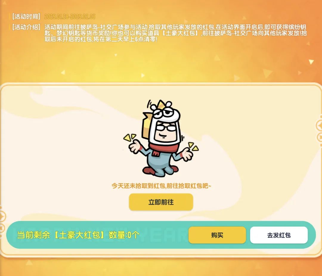 肠肠只要在每天特殊时段前往披萨岛-社交广场就可以遇到财神降临,财神将为肠肠们降下红包雨~在1月28日和1月29日还有特殊加场红包雨!