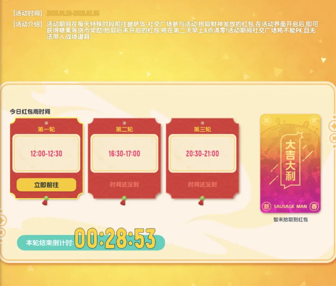1月28日 - 2月3日每天3轮红包雨,第1轮:12:00-12:30,第2轮:16:30-17:00,第3轮:20:30-21:00