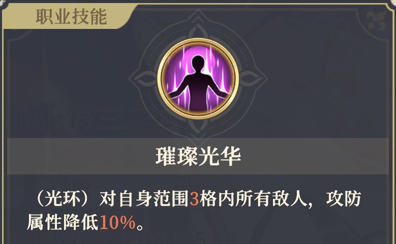 - 歌洛莉亚光环技能【庄严】的升级版,相比【庄严】,光环范围提升至3格,且不仅降低敌人攻击属性,还能降低敌人防御属性。