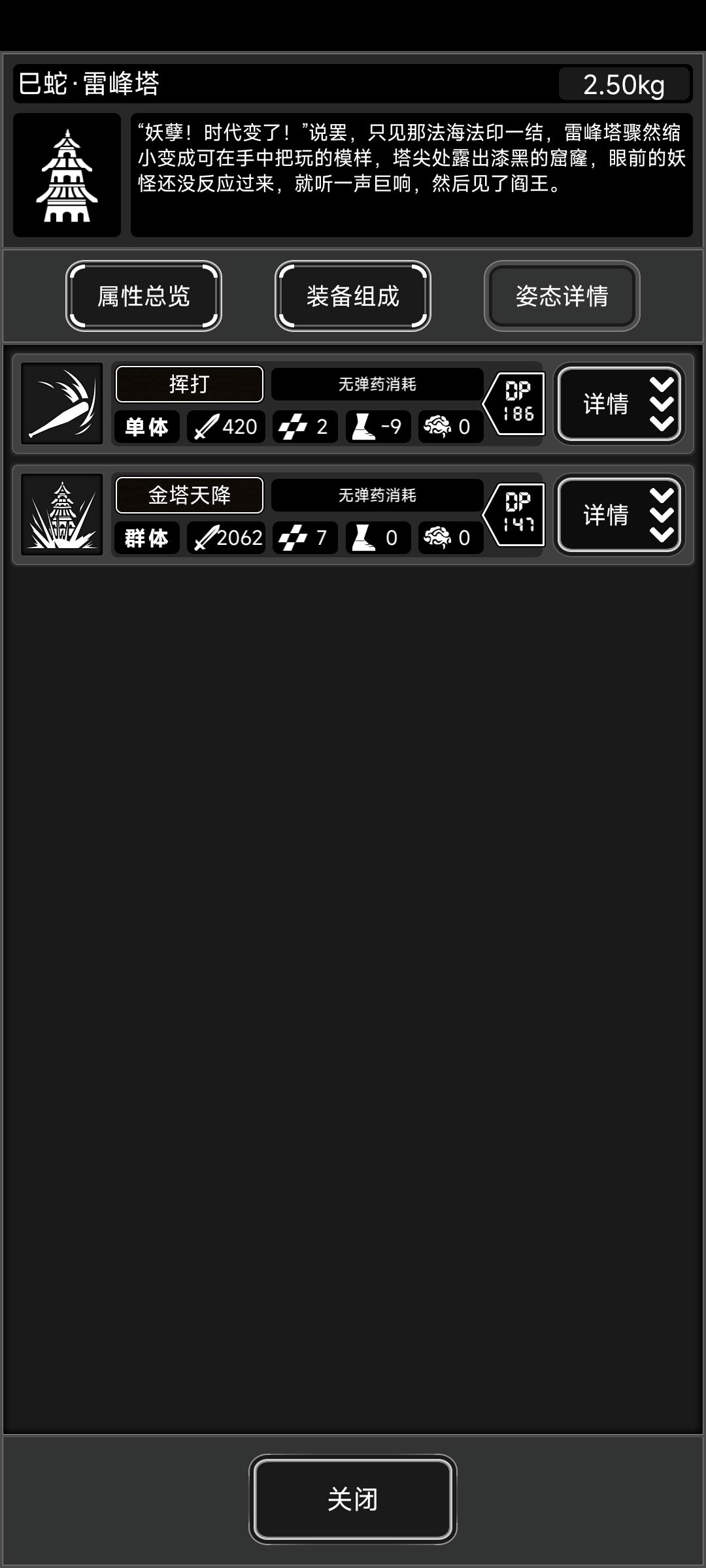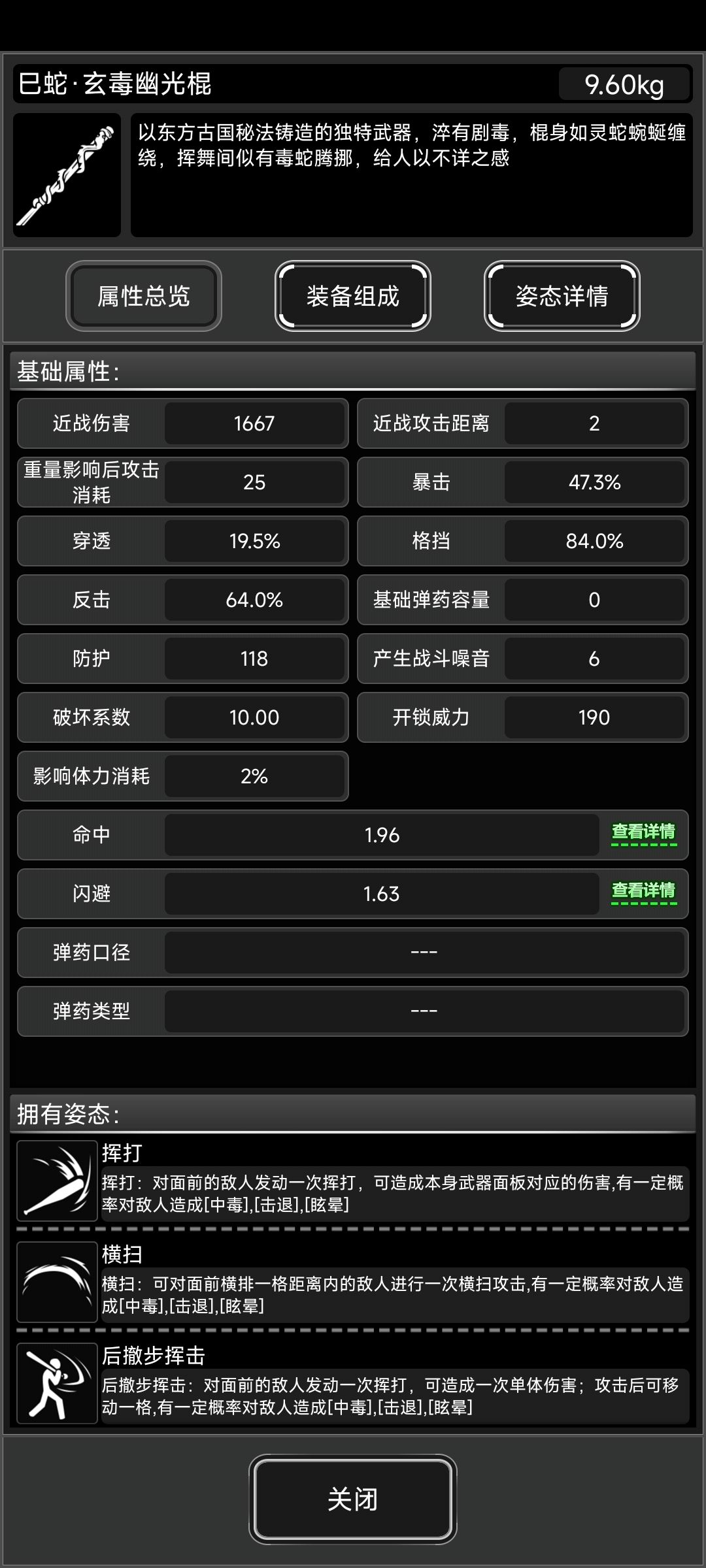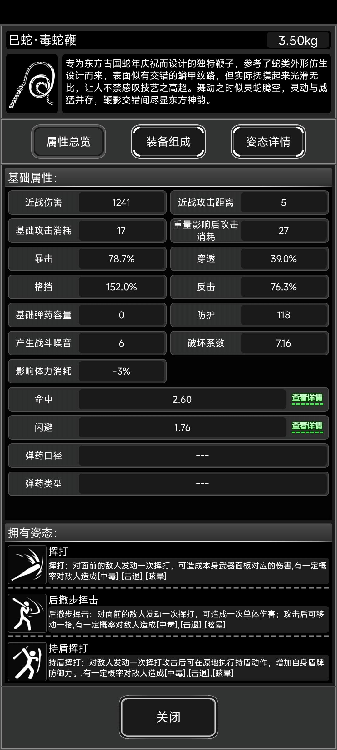 本体是蛇配重,基本上属性和兔配重一致,攻击力不如龙配重,多了150的上毒概率 相当于丧尸的毒抗来说150%的概率算是较低的。
