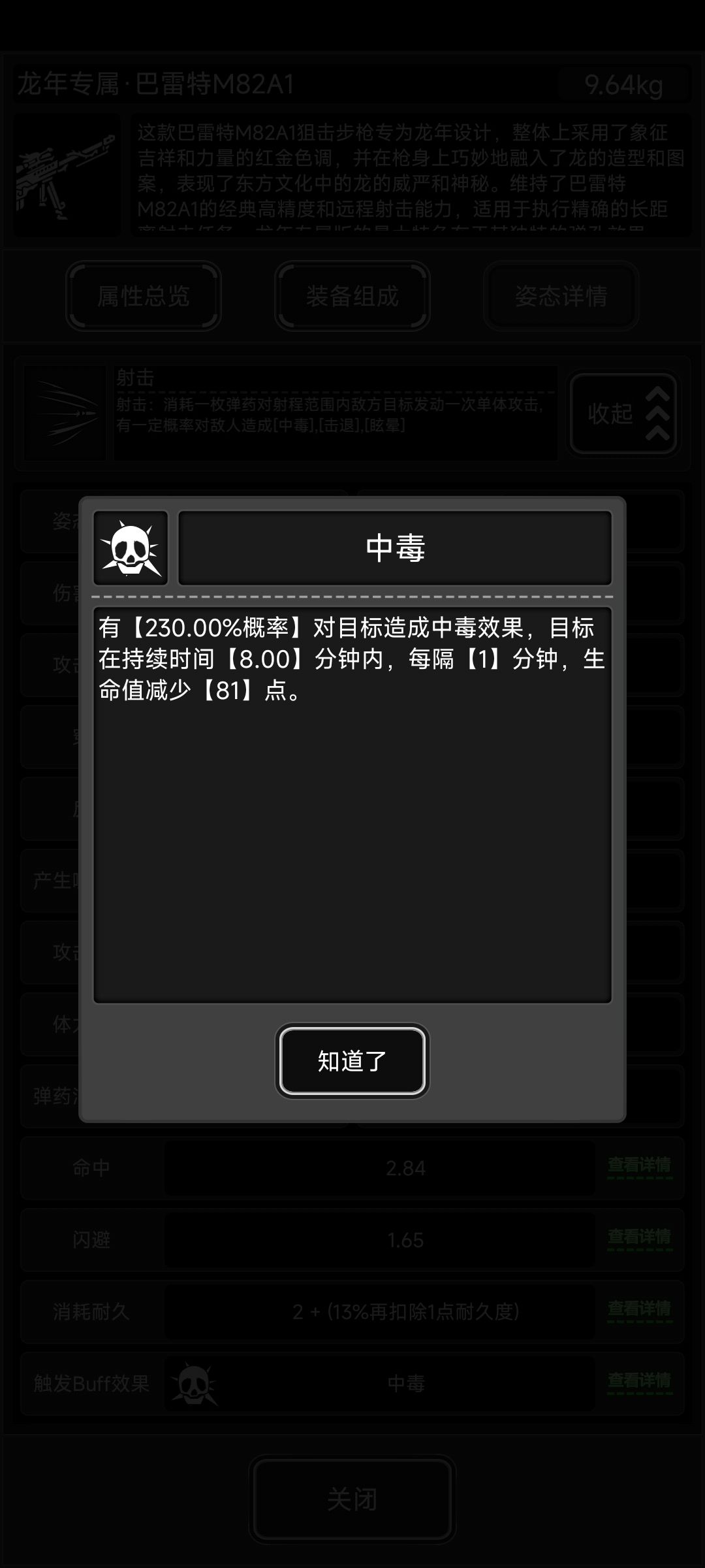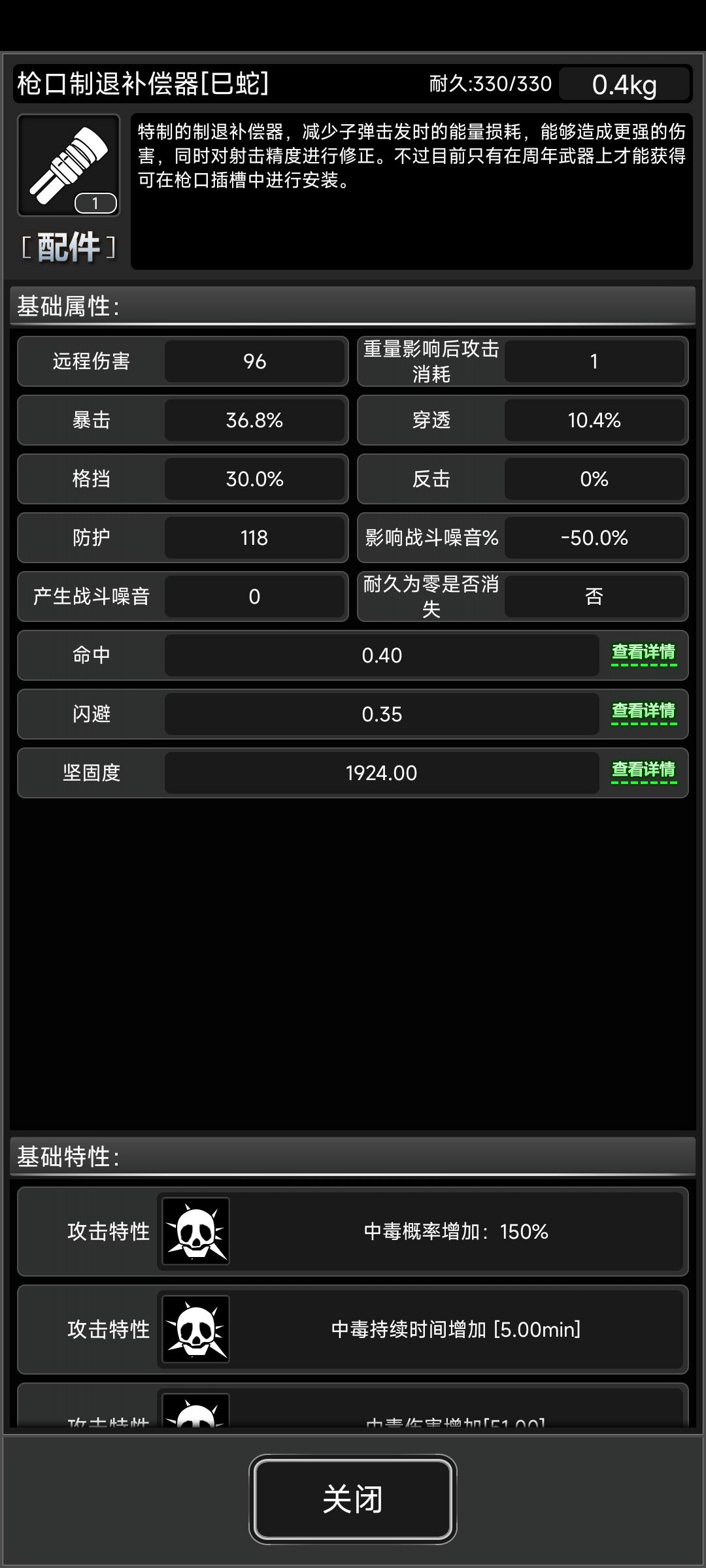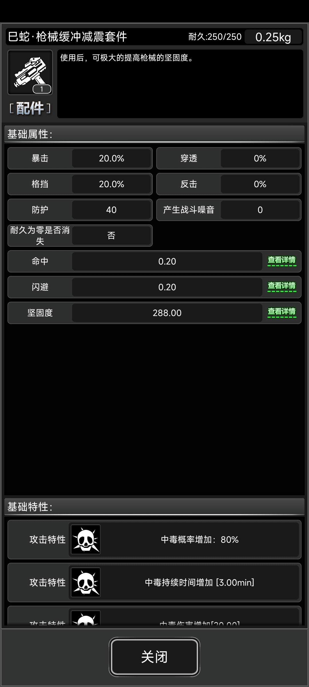 属性和普巴一样,主要是附赠一个蛇限枪械缓冲装置增加枪械整体30%坚固度,占用握把插槽。单独增加的80%上毒概率基本没用,除非搭配毒液弹(丧尸怪毒抗基本为1.3左右对应130%抗性)
