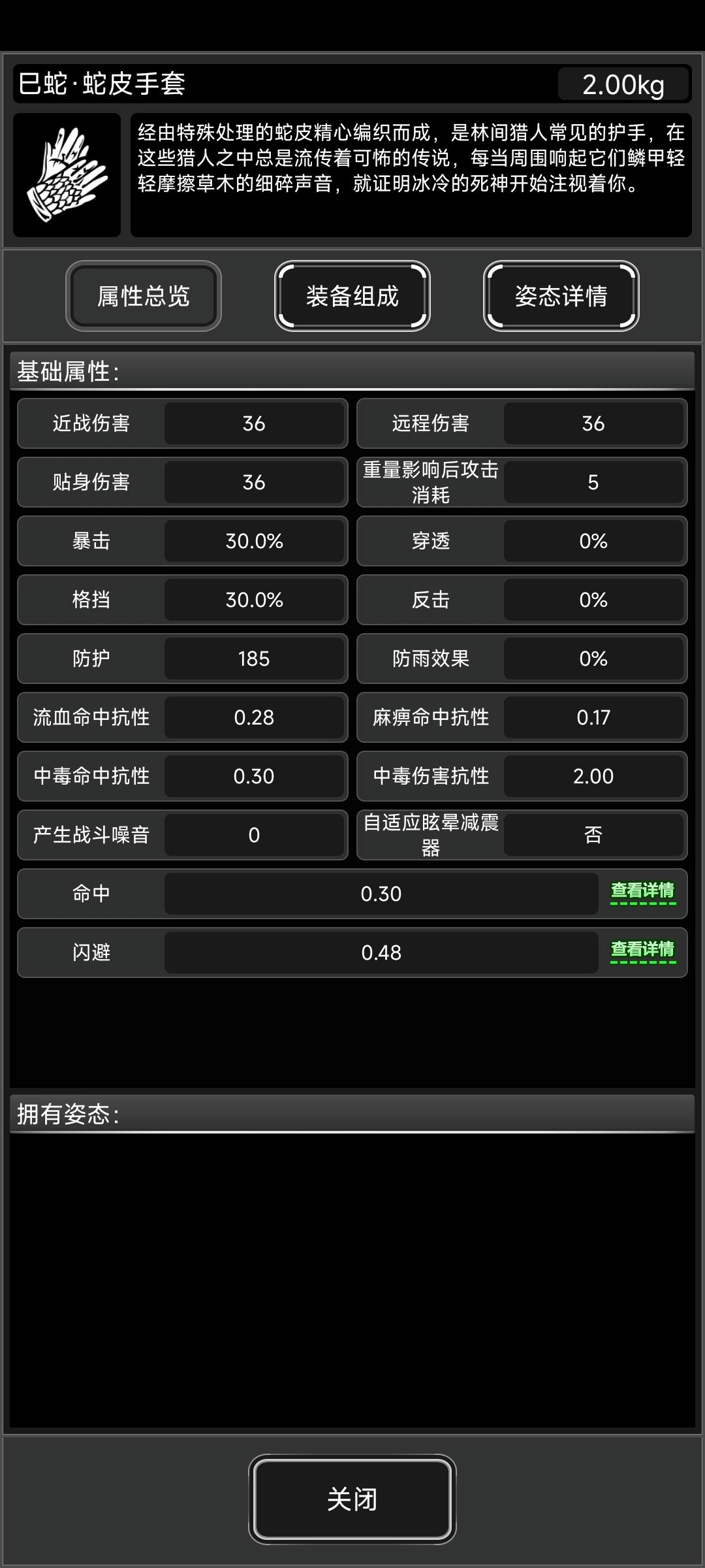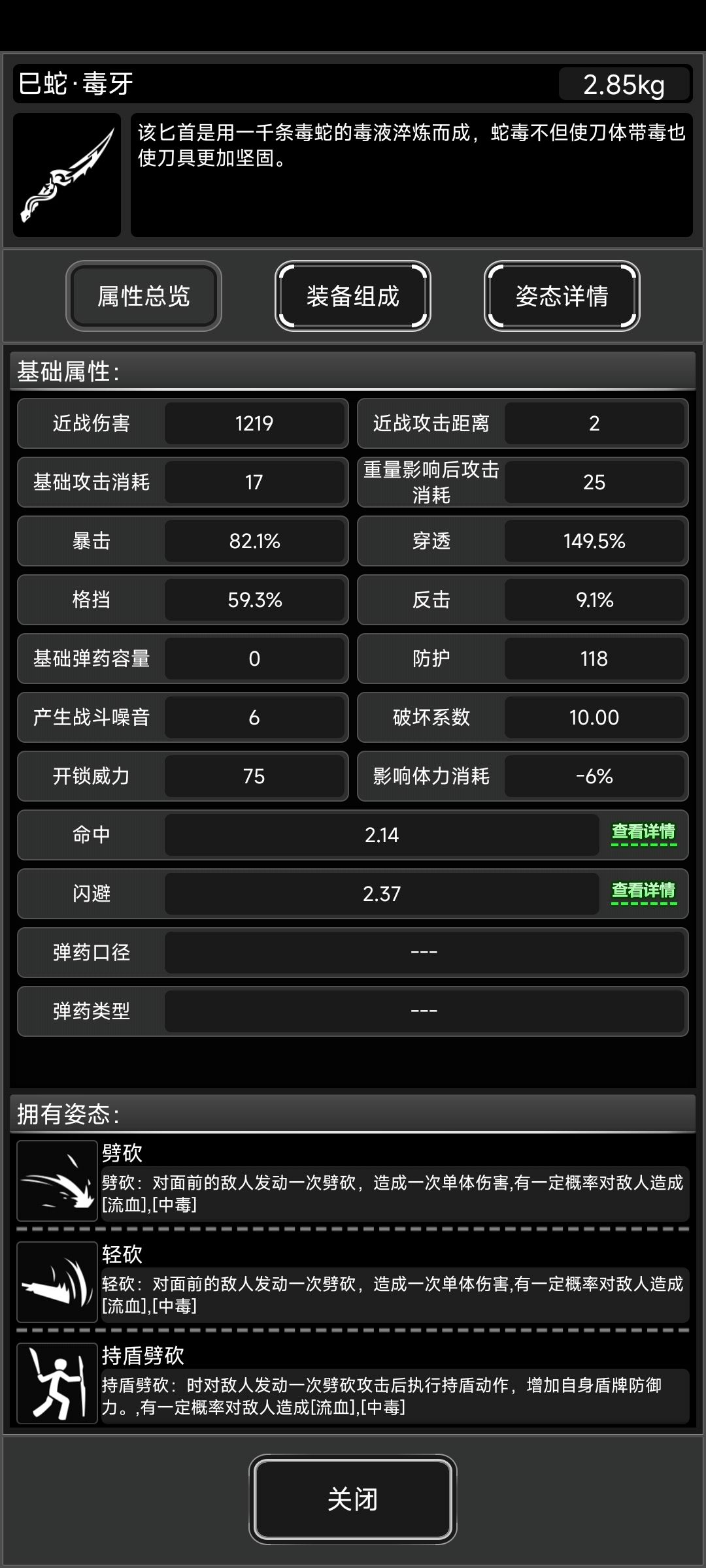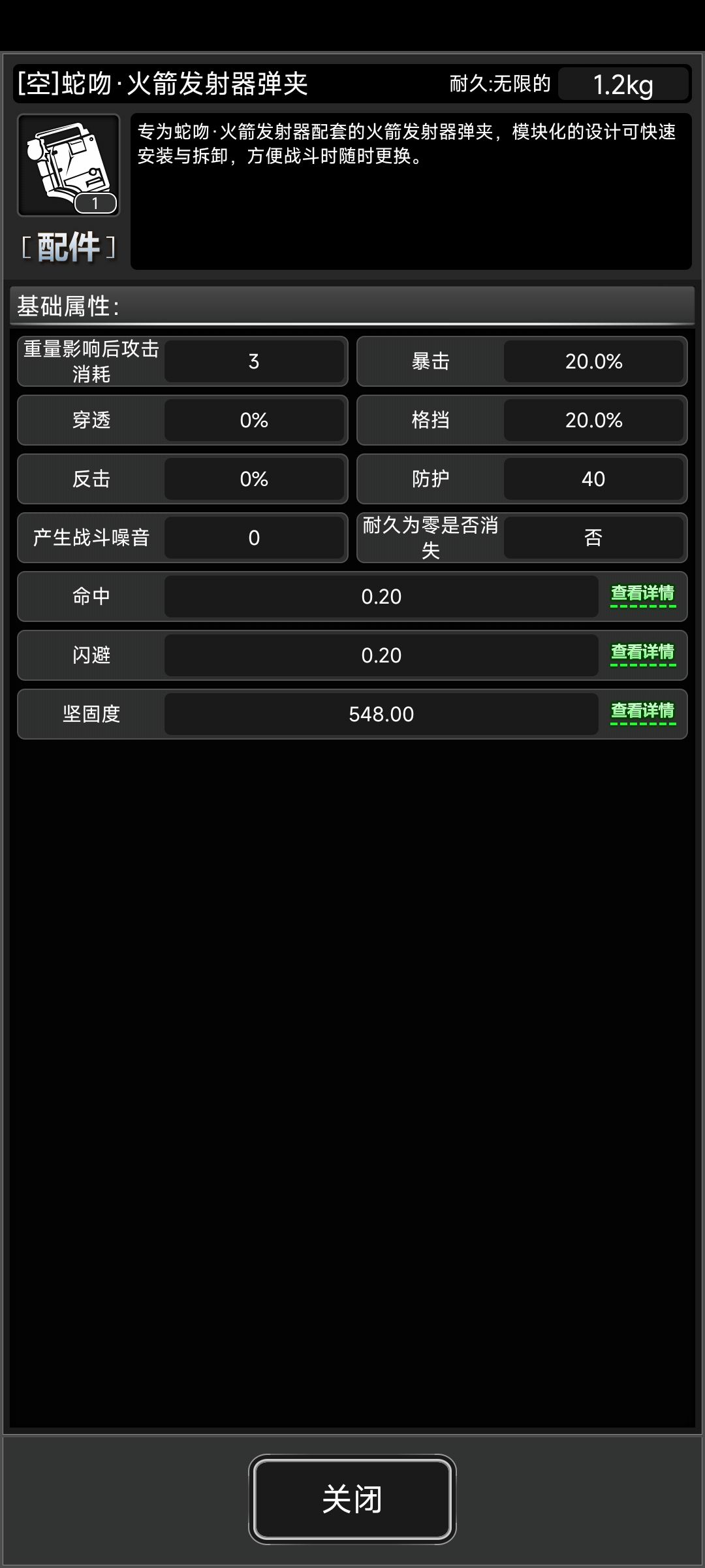属性和普巴一样,主要是附赠一个蛇限枪械缓冲装置增加枪械整体30%坚固度,占用握把插槽。单独增加的80%上毒概率基本没用,除非搭配毒液弹(丧尸怪毒抗基本为1.3左右对应130%抗性)