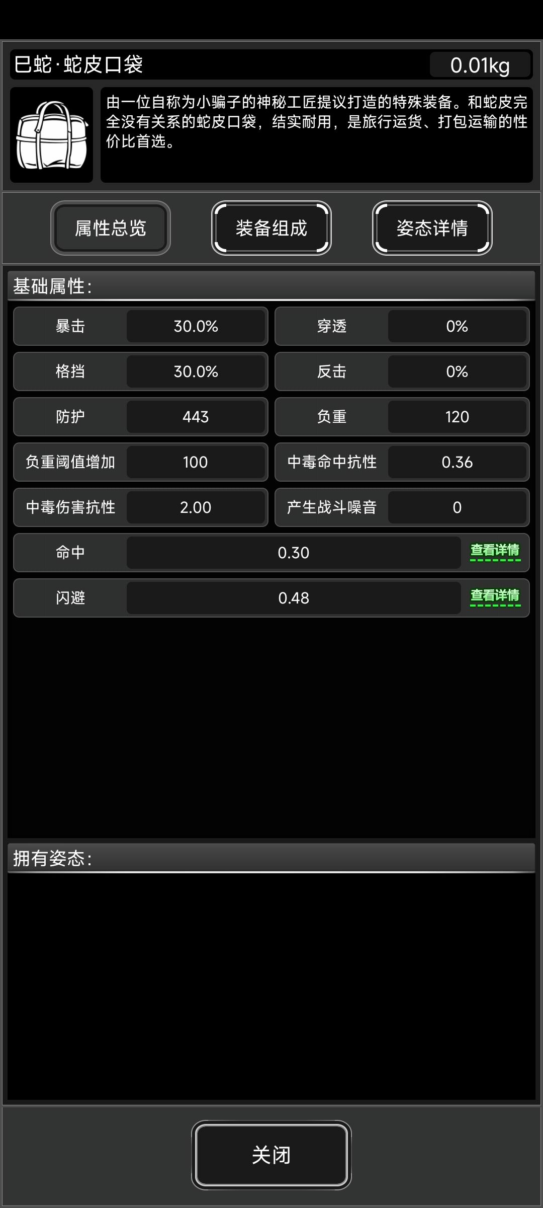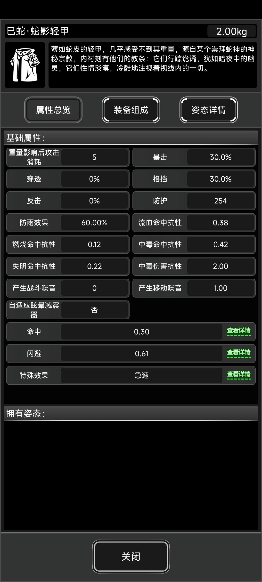 基本属性和蛇轻甲一样 特效为受到伤害时对周围3*3范围造成100点伤害(无穿透)和超大概率上毒,至少测试了几轮,丧尸毒抗最几位之一的诡首,也能做到稳定上毒。