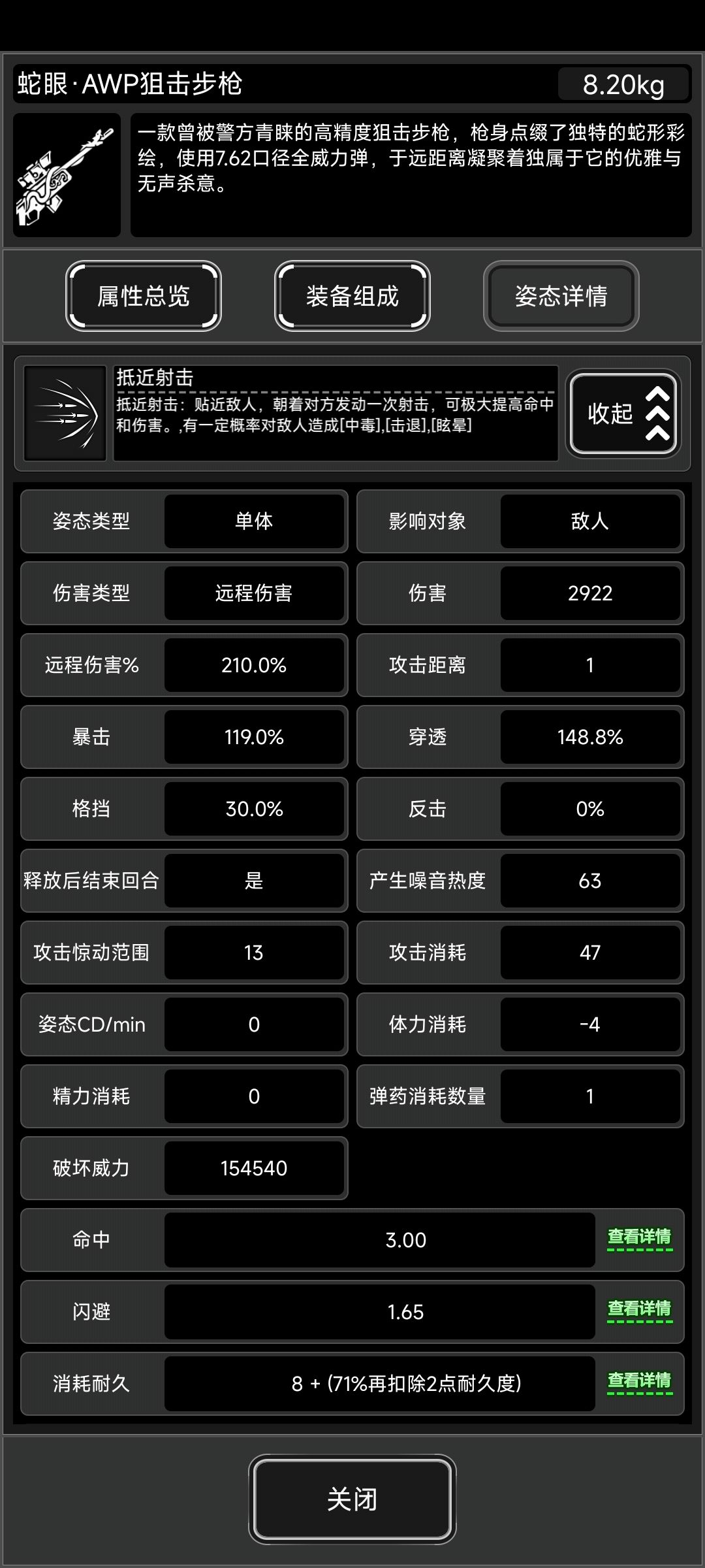 作为狙击枪有高倍率抵近射击姿态(无CD),虽然蛇武本身都是没熟练度的,但是抵近射击有熟练度,稍微练一下面板可以上3000,dp消耗贼少(47)