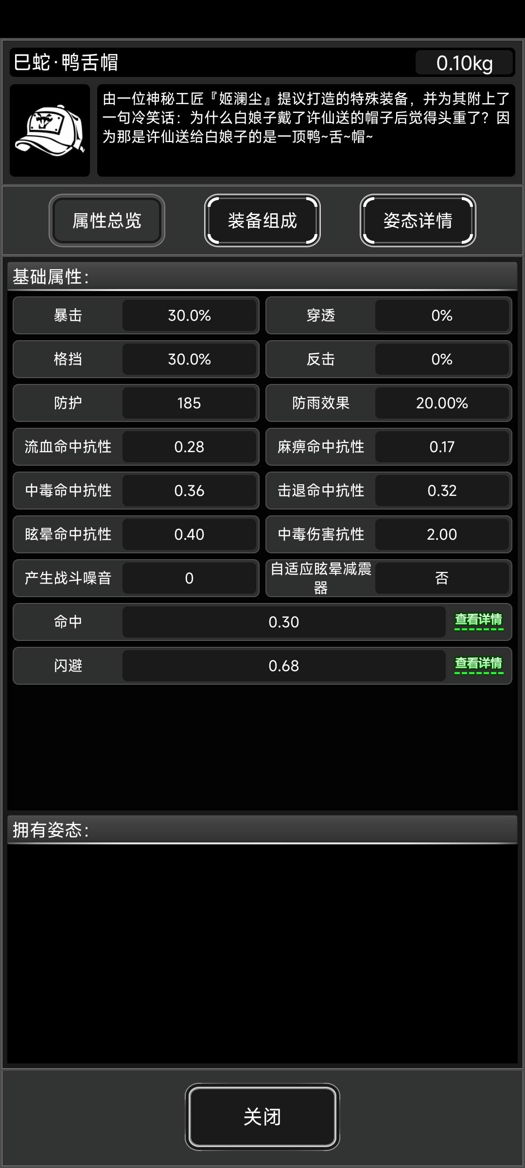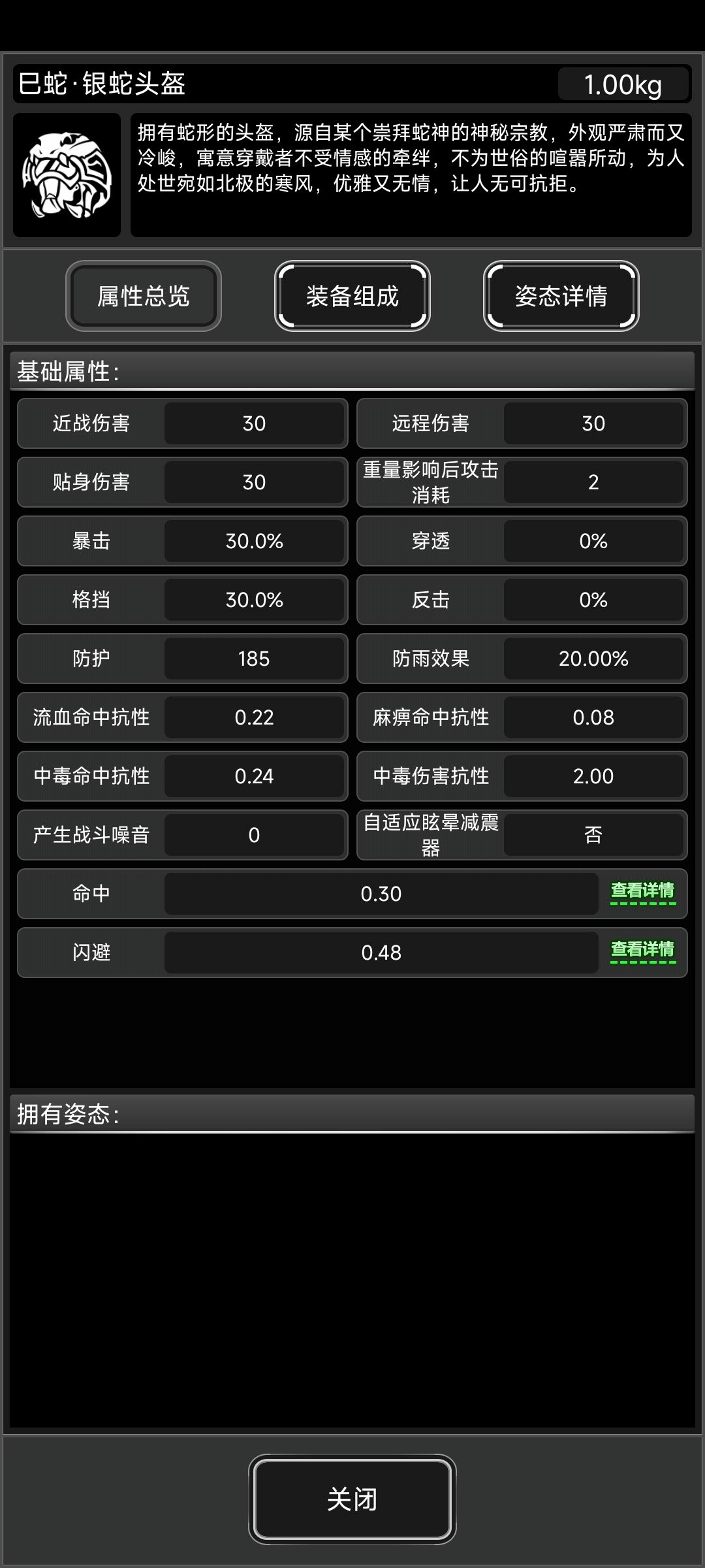 两种蛇头中的抗性头,基本防御为52,比龙头40要高,相较于龙头来说少了燃烧抗性多了击退抗性且因为没有其他零件,在抗性上是要低于龙头的。但是蛇帽可以装科技配件,等未来科技配件实装,鸭舌帽一件便可以做到基本免疫眩晕效果。
