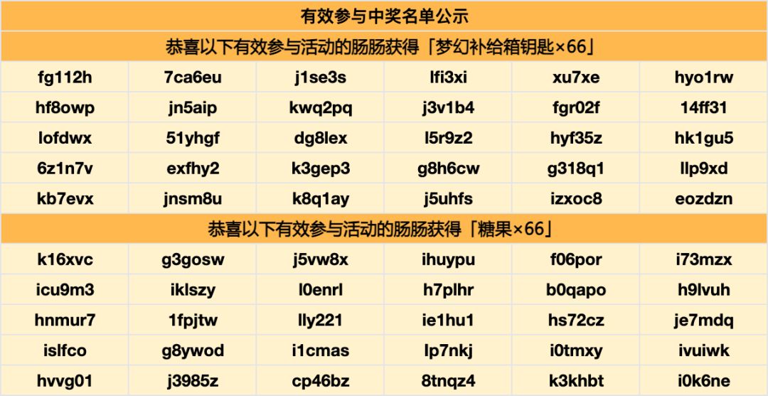 开奖啦!恭喜肠肠获得以下奖励~梦幻补给箱钥匙和糖果奖励将会在14个工作日内发放到邮箱,请注意查收!