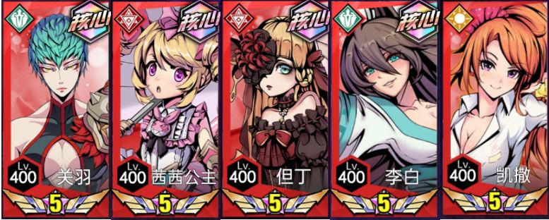 阵容核心-关羽通过开箱很容易获得,茜茜公主比较好出,但丁和茜茜可以在英雄商店获取,李白也是比较容易出的英雄(可用南丁格尔取代),凯撒在俱乐部抽卡也容易抽出。
