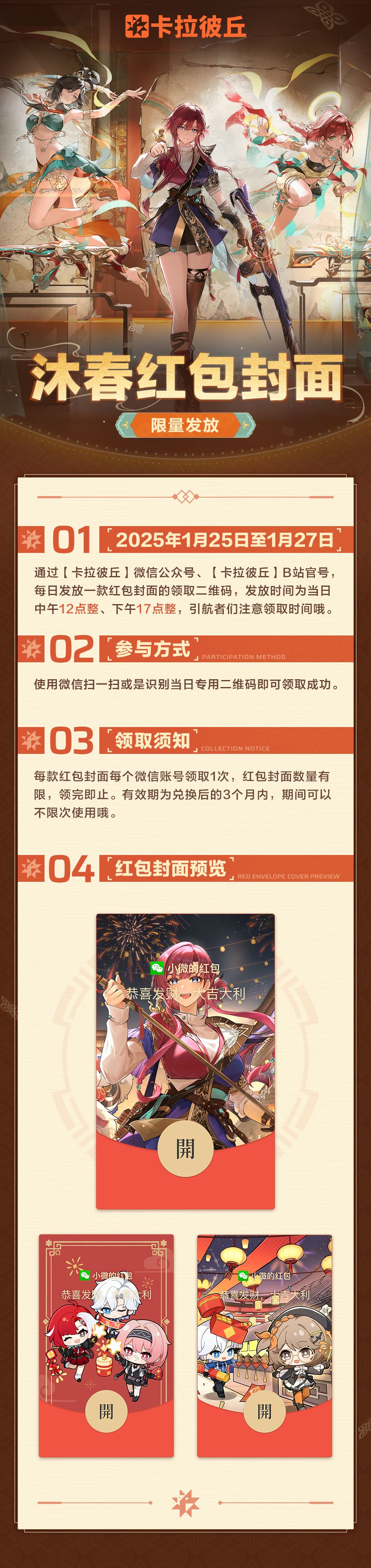 领取时间:1月25日~1月27日期间,每天中午12:00、下午17:00两个时间段,将在《卡拉彼丘》公众号、《卡拉彼丘》B站官号发放定制款微信红包封面,数量有限,领完即止哦!