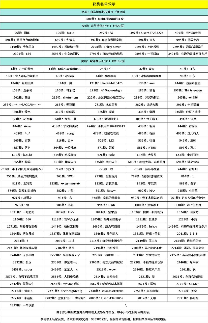 3、评论每达到“99、199、299......”这类差1就满百的楼数时,随机抽取该范围内1位玩家赠送春节特供礼包*1!