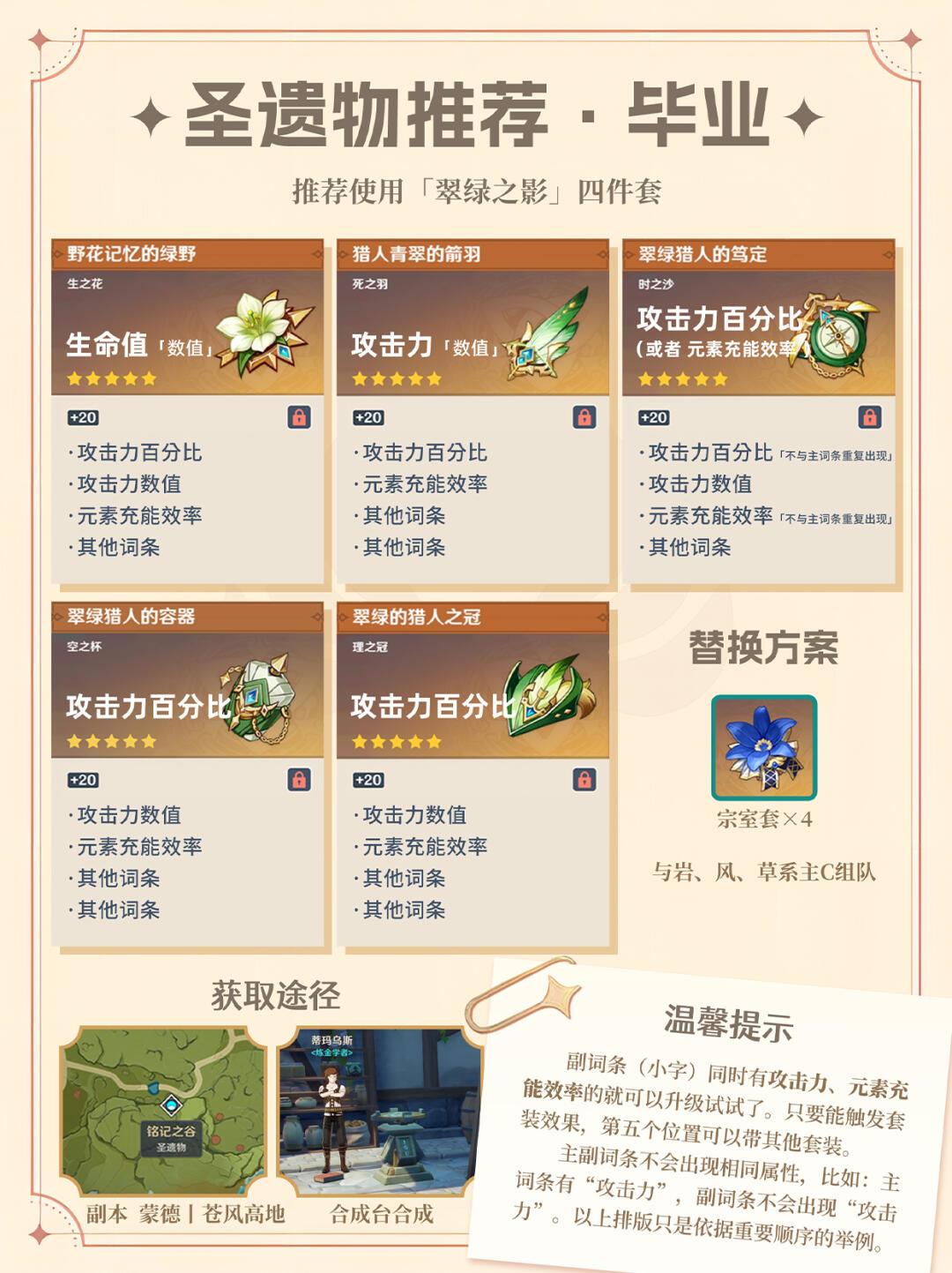 除圣遗物方面:毋庸置疑推荐【翠绿之影】4件套实现减抗的辅助能力。如果队伍中还有一套【翠绿之影】,蓝砚可以考虑使用【昔日宗室之仪】4件套,同时多堆一些元素充能效率。