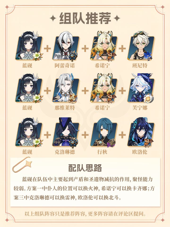 组队方面:推荐蓝砚佩戴【翠绿之影】4件套,加入到水、火、雷、冰的纯色队中,是比较好的选择。