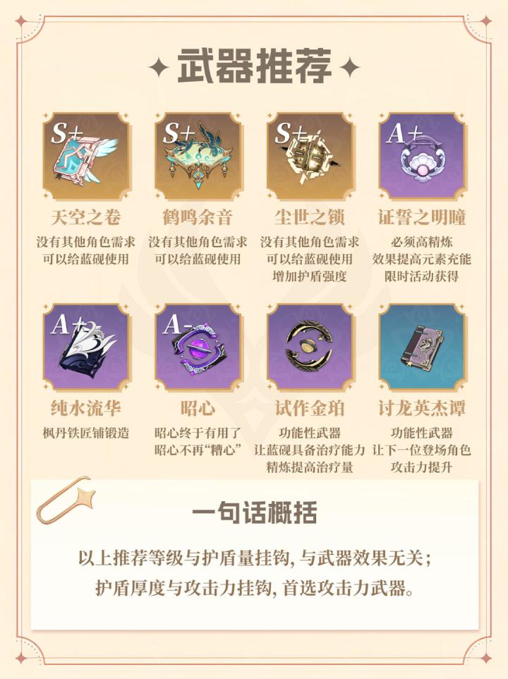 武器方面:首选攻击力高的武器,如果队伍需要治疗,也可以使用【试作金珀】,同时需要堆一些元素充能效率。