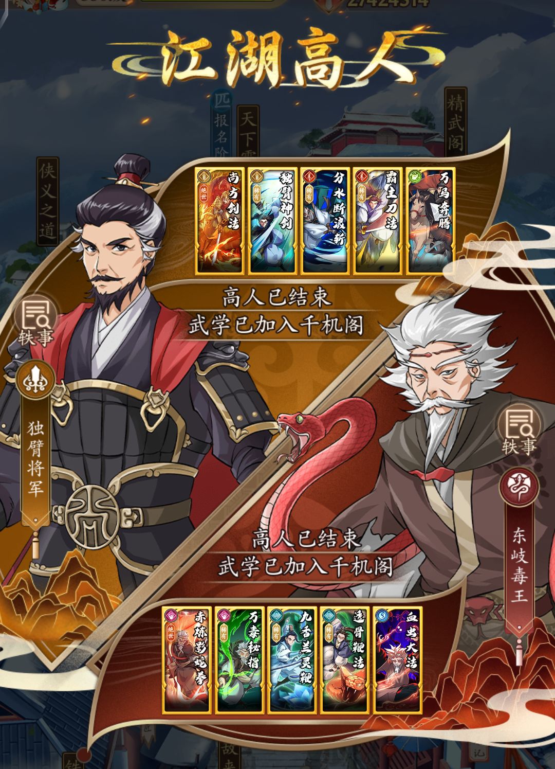 门派如果是调和奇的开始,那高人就是起飞的起点,出现了很多的优质招式,有条件的我建议全部128,开完招式直接抽龙王,由于图片格式问题,我只放一个图片讲两个高人,如果有问题的建议性看前面的门派篇