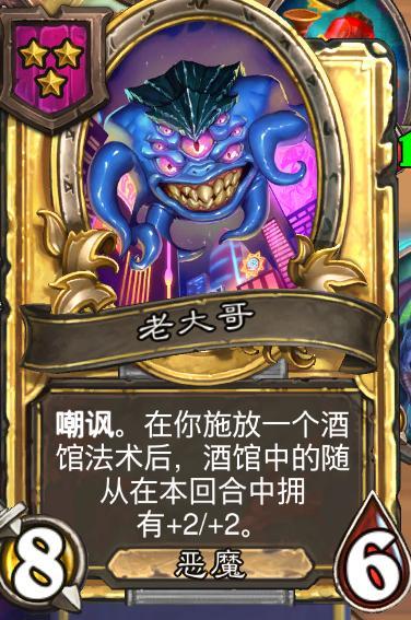 现版本恶魔身材成长主要还是靠三本的老大哥,在施放一个酒馆法术后,使得酒馆中的随从在本回合获得+1/1,合金之后是+2/2。从触发体系可以看出,如何获取大量酒馆法术就是玩好恶魔的关键,英雄方面可以选择一些法术相关的。有鱼人的对局可以考虑用邪能元素战吼养酒馆,毕竟这个玩法我们是要带铜须的,构件齐全成长还是很可观的,不过成型难度比较大,建议还是选择老大哥这种泛用性更强的随从卡。