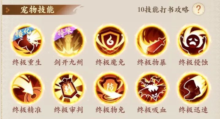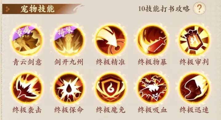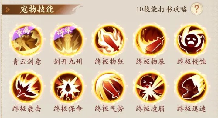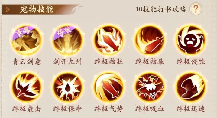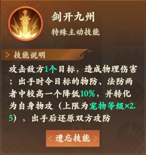 剑开九州:攻击敌方1个目标,造成物理伤害;出手时令目标的物防、法防两者中较高一个降低10%,并转化为自身物攻(上限为宠物等级x2.5)出手后还原双方攻防。