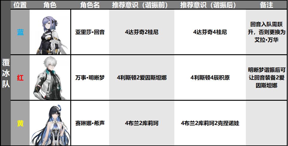 ④、配队推荐:过渡期搭配为希声+凛冽(初始S级角色,可通过新手任务自选箱免费获取)/任意A级物理装甲型+清商(初始A级角色)/蚀暗(初始B级角色,御三家之一);成型队伍为希声+檀心(初始S级角色)+回音(初始S级角色);覆冰队成员为:希声+明晰梦(初始S级角色)+回音(初始S级角色,入队需跃升否则换成艾拉·万华)