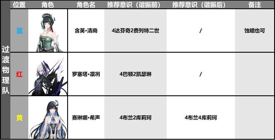 组成成员为:希声、清商、凛冽或任意物理装甲型,搭配推荐如下