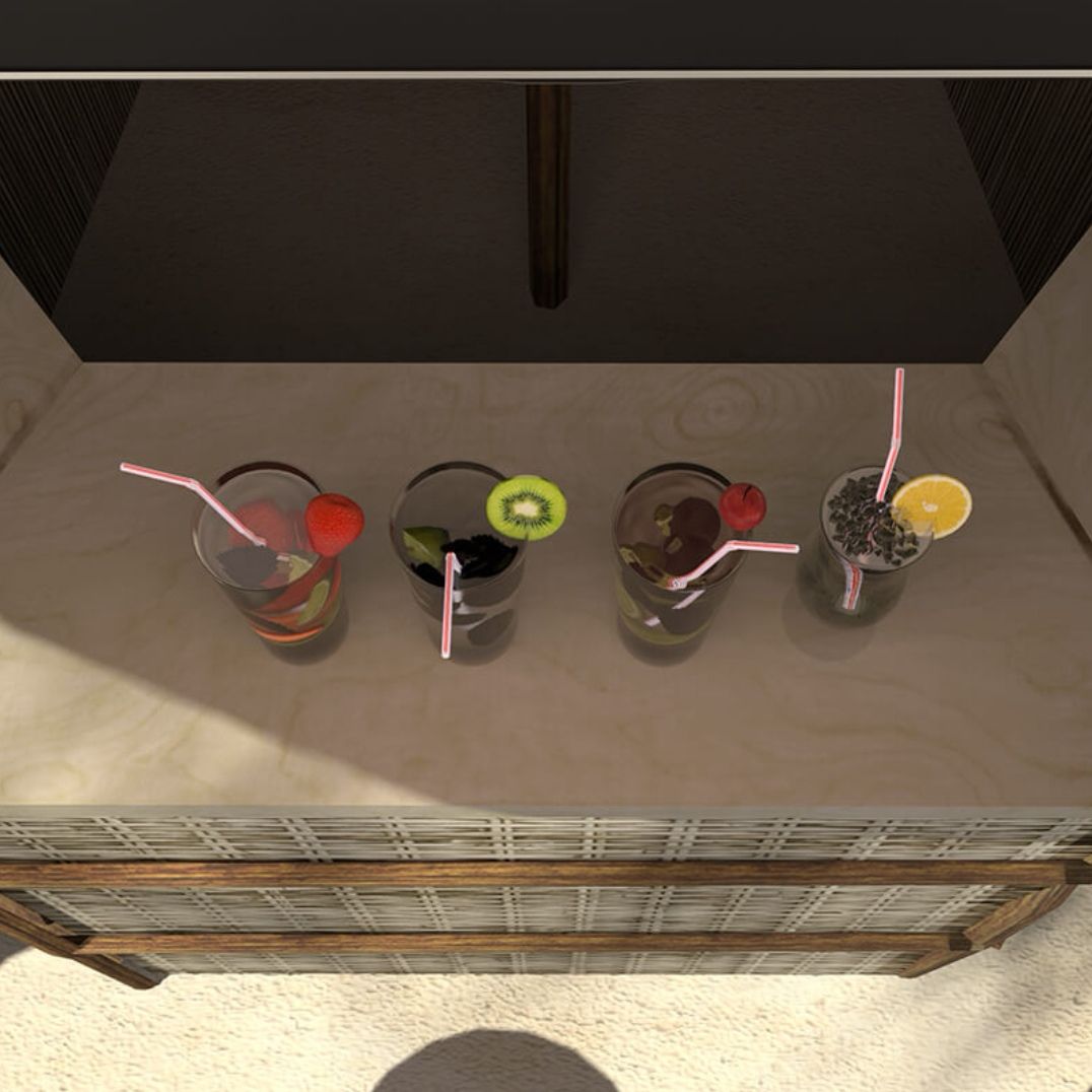 12.在下图位置的桌子上,可以发现四杯饮料,注意上面的水果,和吸管的方向,打开电视下的第一个柜子,拿到一个照相机。