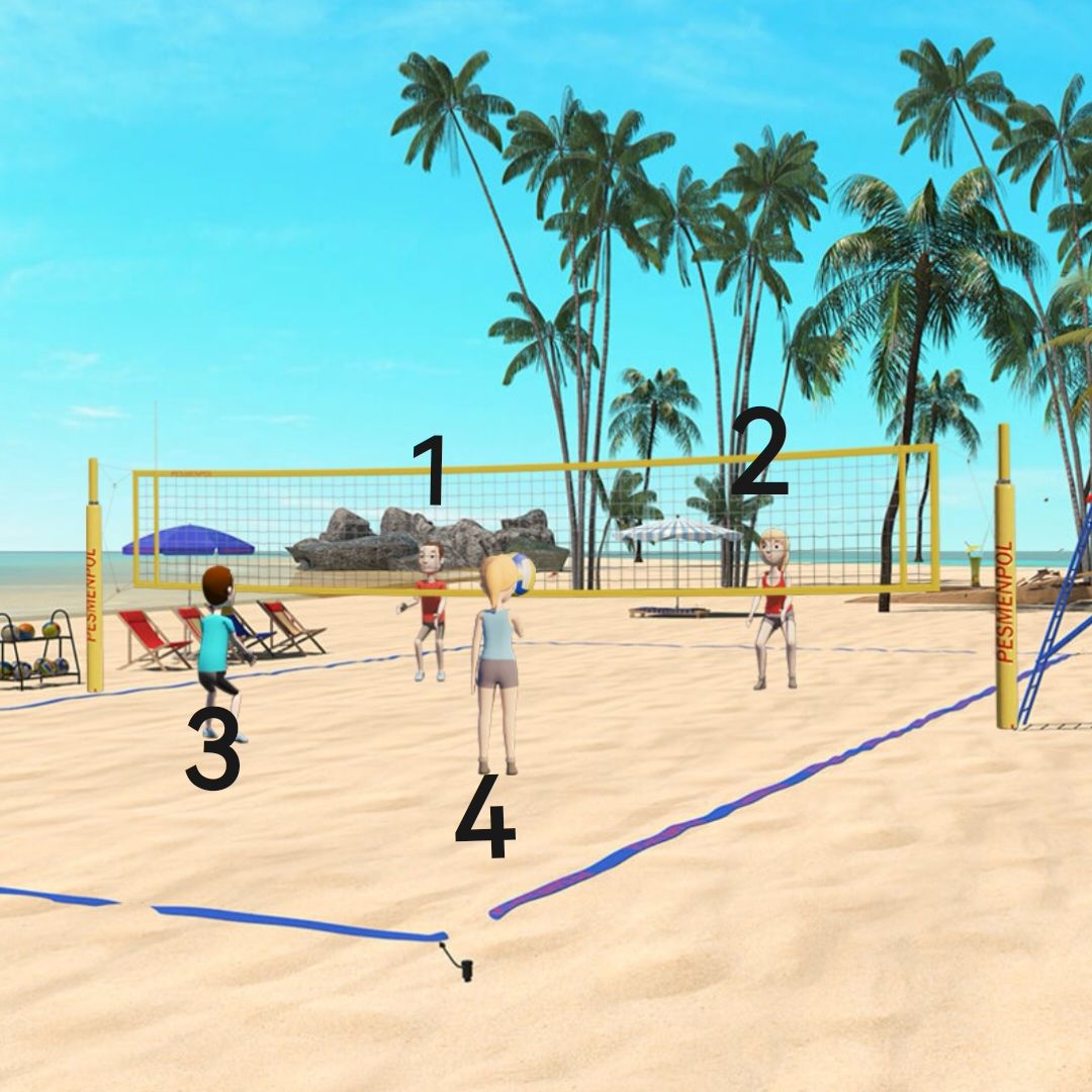 19.把排球给蓝色衣服的女生,给四个人编号,记住排球传的顺序:423132,打开粉色衣服旁边的木桶,拿到一把吉他。
